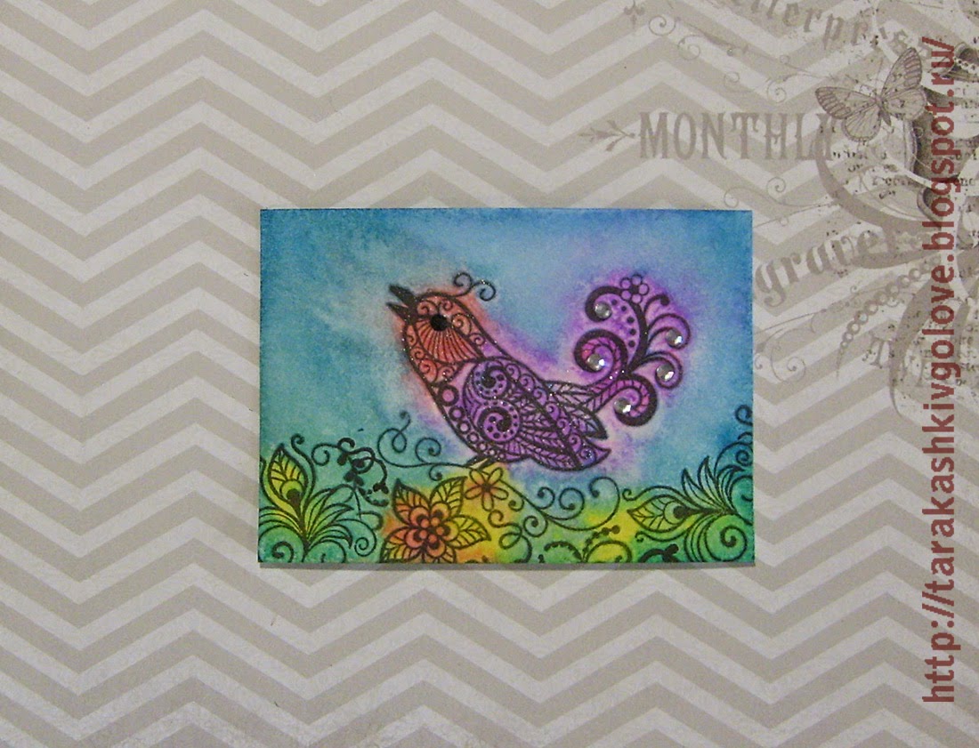 Материалы: акварельная бумага и акварельные краски, штампы, Perfect Pearls, маркер с блестками и стразы.